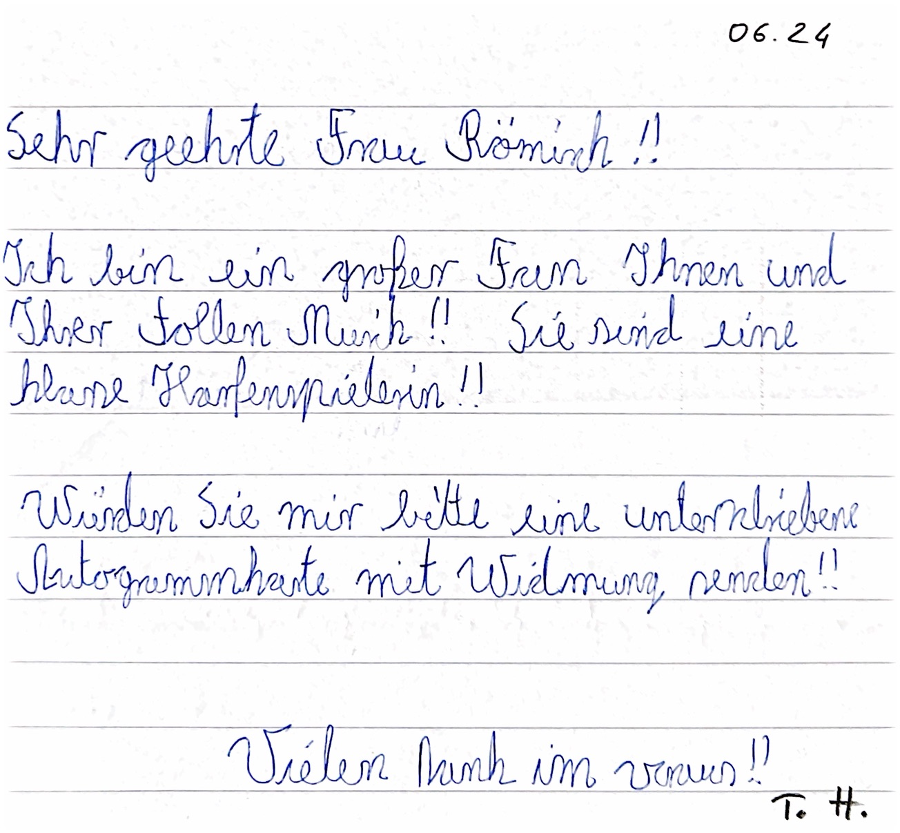 Bleiben Sie deshalb erfolgreich, ich denke sehr gerne zurück an dieses wunderschöne Klangerlebnis von Ihnen mit den beiden Harfen ...